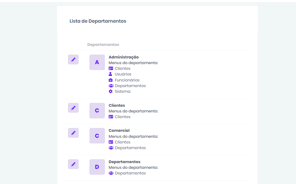 O Sprout possui módulo de departamentos com disponibilidade para configurações de privilégios por menu. Onde, o mesmo usuário poderá fazer parte de diferentes departamentos.