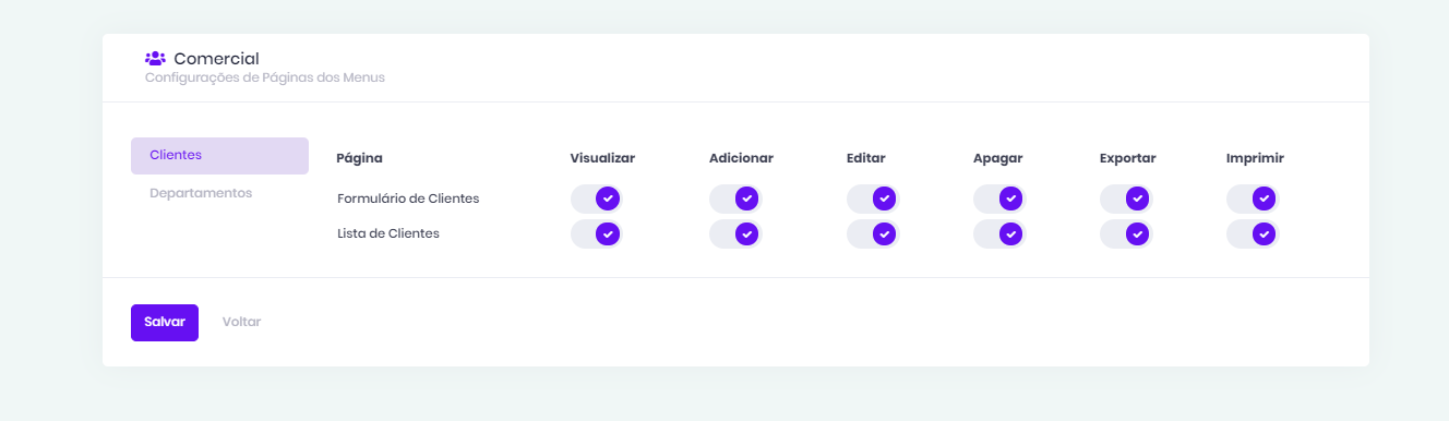 É possível definir o nível de privilégios associando aos menus que o departamento terá acesso.