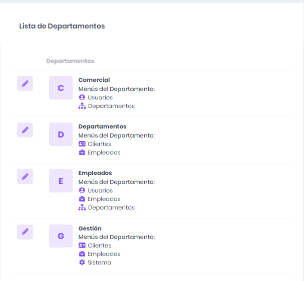 En la siguiente pantalla solo se listarán los menús asociados en la columna de la izquierda, así como las páginas a las que puede acceder el departamento.