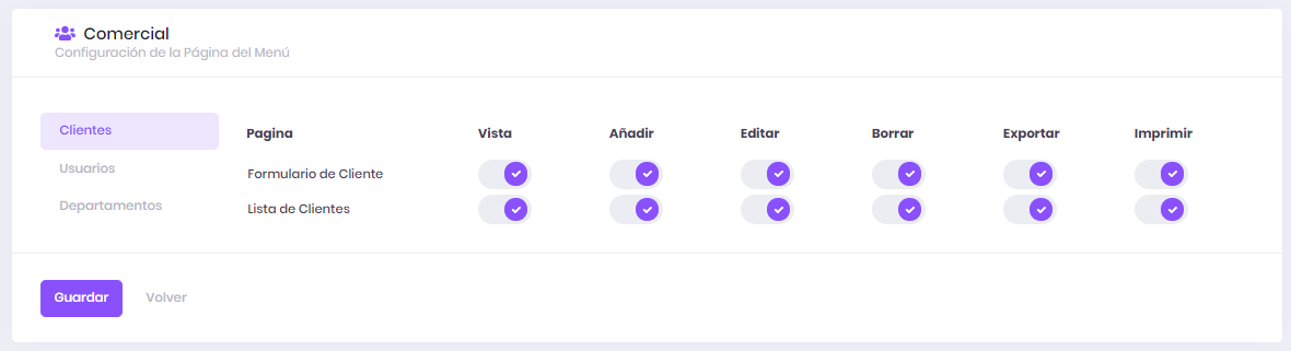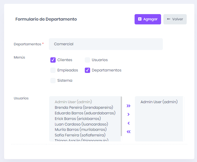 Es posible definir el nivel de privilegios asociando los menús a los que tendrá acceso el departamento.