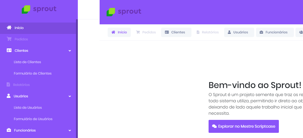 O item Início é o primeiro item do menu e tem como objetivo carregar a primeira página que será exibida, após o acesso ao Sprout.